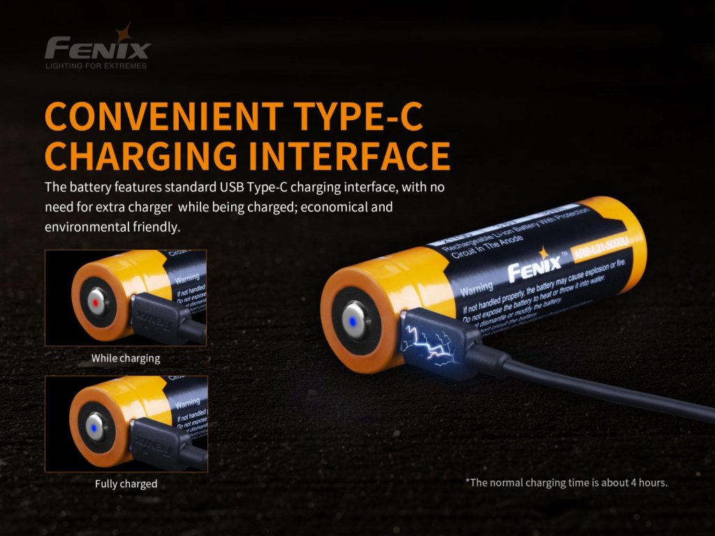Nabíjateľná batéria Fenix 21700 5000 mAh (ARB-L21-5000U) s vlastným nabíjacím USB-C konektorom. Možno ju nabíjať pripojením kábla do USB-C konektora (napr. z počítača, powerbanky či nabíjačkou na mobilný telefón) alebo aj v klasickej nabíjačke na Li-ion.