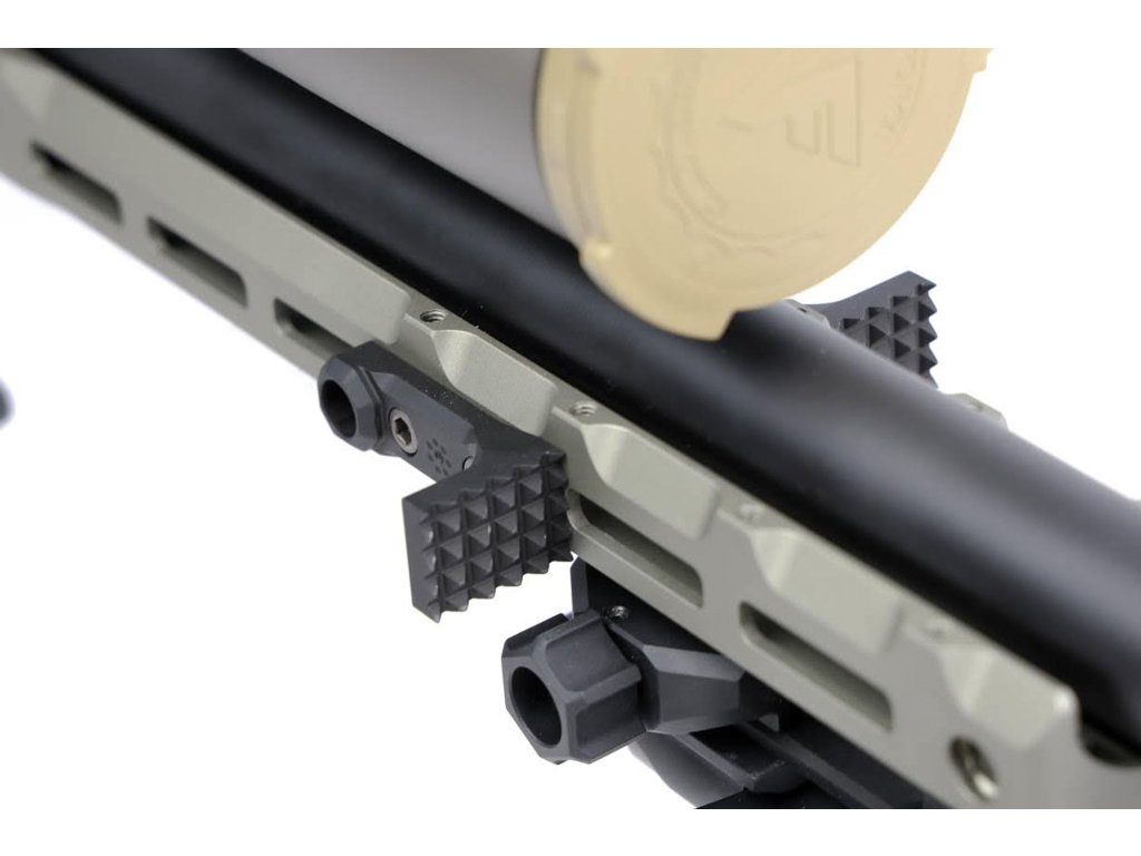 Zarážka Arisaka Barricade Stop kombinuje zmäkčovač mäsa s otočnou objímkou QD s obmedzenou rotáciou, čím šetrí drahocenný priestor na konci predpažbia M-Lok. Špicatý koniec má dostatočný záber, aby poskytoval dodatočnú stabilitu pri okraji stien, dverí alebo akejkoľvek vhodnej barikády.