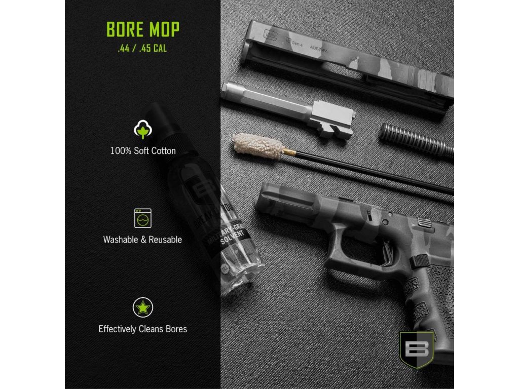 Čistiace mopy Breakthrough Clean Technologies® na hlaveň .44 / .45 zo 100 % bavlny sú mäkké, umývateľné a účinné pri čistení hlavne. Štandardný závit #8-32 (štandardný závit pre brokovnicu #5/16-27 na 20g/12g). Dostupné pre väčšinu kalibrov a puškových nábojov.