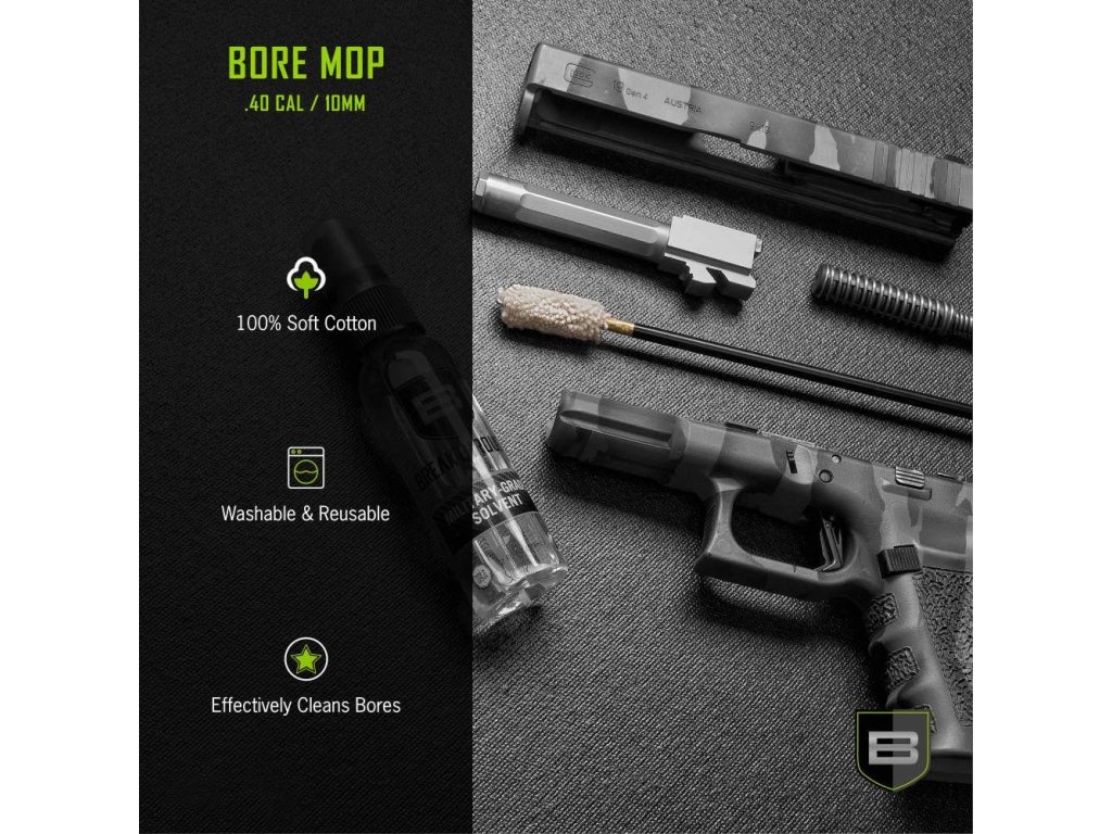 Čistiace tampóny Breakthrough Clean Technologies® kalibru .40 / 10 mm Bore Mop zo 100 % bavlny sú mäkké, umývateľné a účinné pri čistení hlavne. Štandardný závit č. 8-32 (štandardný brokový závit č. 5/16-27 na 20 g/12 g). Dostupné pre väčšinu kalibrov a puškových nábojov.