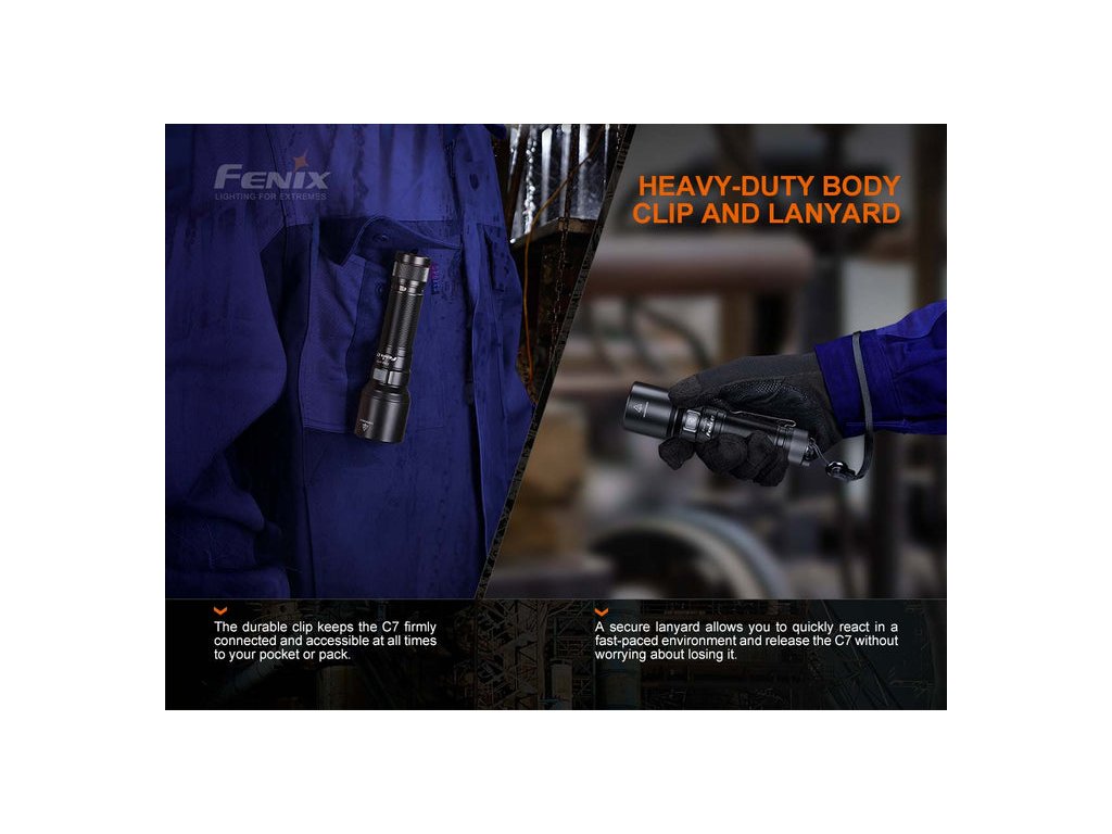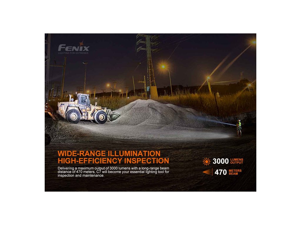 Svietidlo Fenix C7 je vysokovýkonné svietidlo, ktoré je perfektným nástrojom pre priemyselné a údržbárske prevádzky. Vďaka svetelnému toku až 3000 lúmenov dokáže svietidlo Fenix C7 vrhať svetlo do maximálnej vzdialenosti 470 m (1542 stôp).
