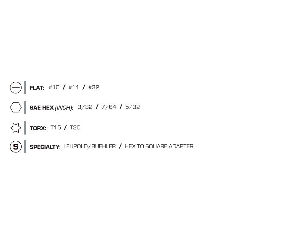 - Šetrnosť k zbrani: Špeciálne „Hollow-Ground“ bity presne pasujú do drážok skrutiek, čím chránia ich povrch aj vzhľad zbrane.