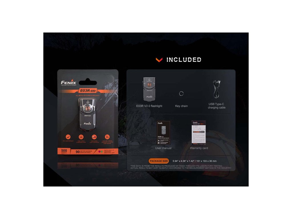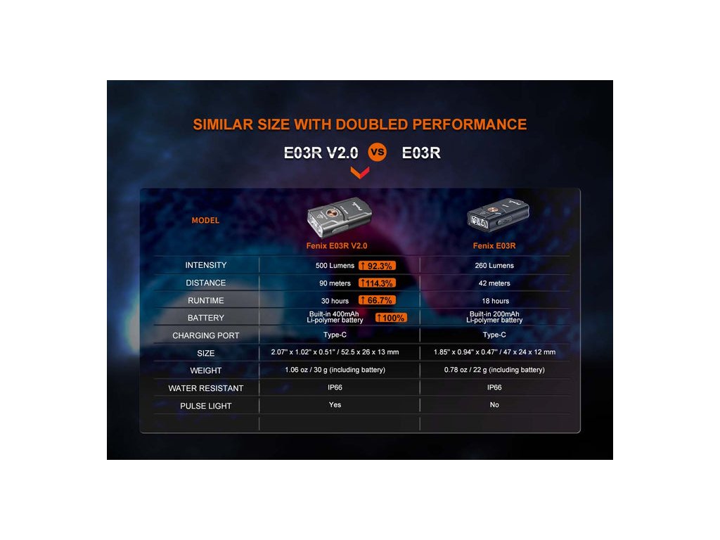Super malá a kompaktná nabíjateľná kľúčenská baterka Fenix E03R V2.0 sa vyznačuje vylepšeným výkonom s extrémne jasným maximálnym svetelným tokom 500 lúmenov.