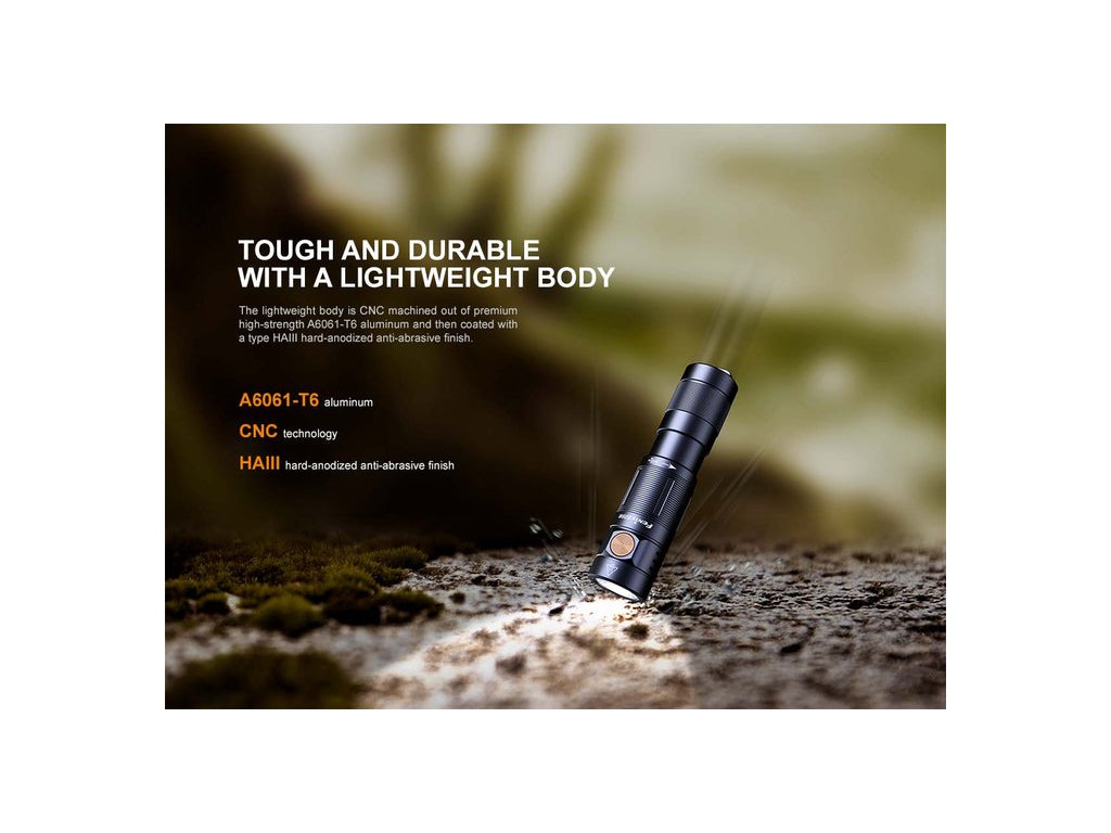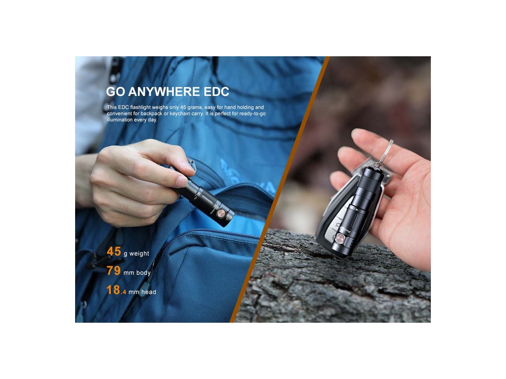 Nabíjateľná baterka Fenix E09R je perfektným spoločníkom na každodenné nosenie. S dĺžkou iba 8,4 cm a priemerom menším ako 2,5 cm dokáže táto malá baterka ľahko osvetliť vaše okolie.