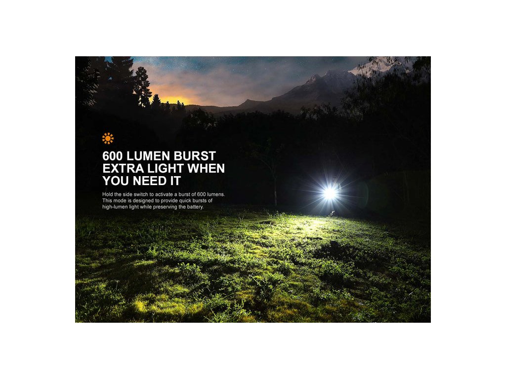 Bočný prepínač umožňuje prepínať medzi štyrmi úrovňami jasu vrátane režimu mesačného svitu pre detailné úlohy, ktorý vydrží až 70 hodín. A keď potrebujete ešte viac svetla, zvoľte režim Burst pre krátky svetelný lúč so svietivosťou 600 lúmenov.