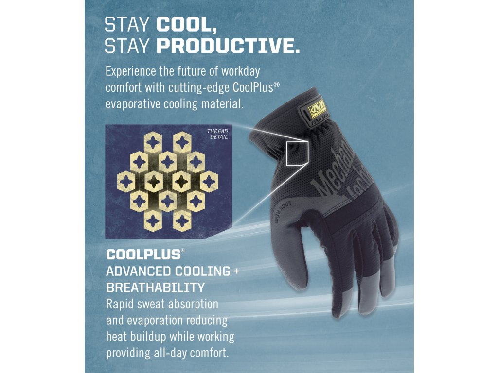 - Chrbát ruky z tkanej sieťoviny CoolPlus® znižuje hromadenie tepla počas práce.