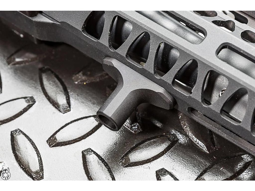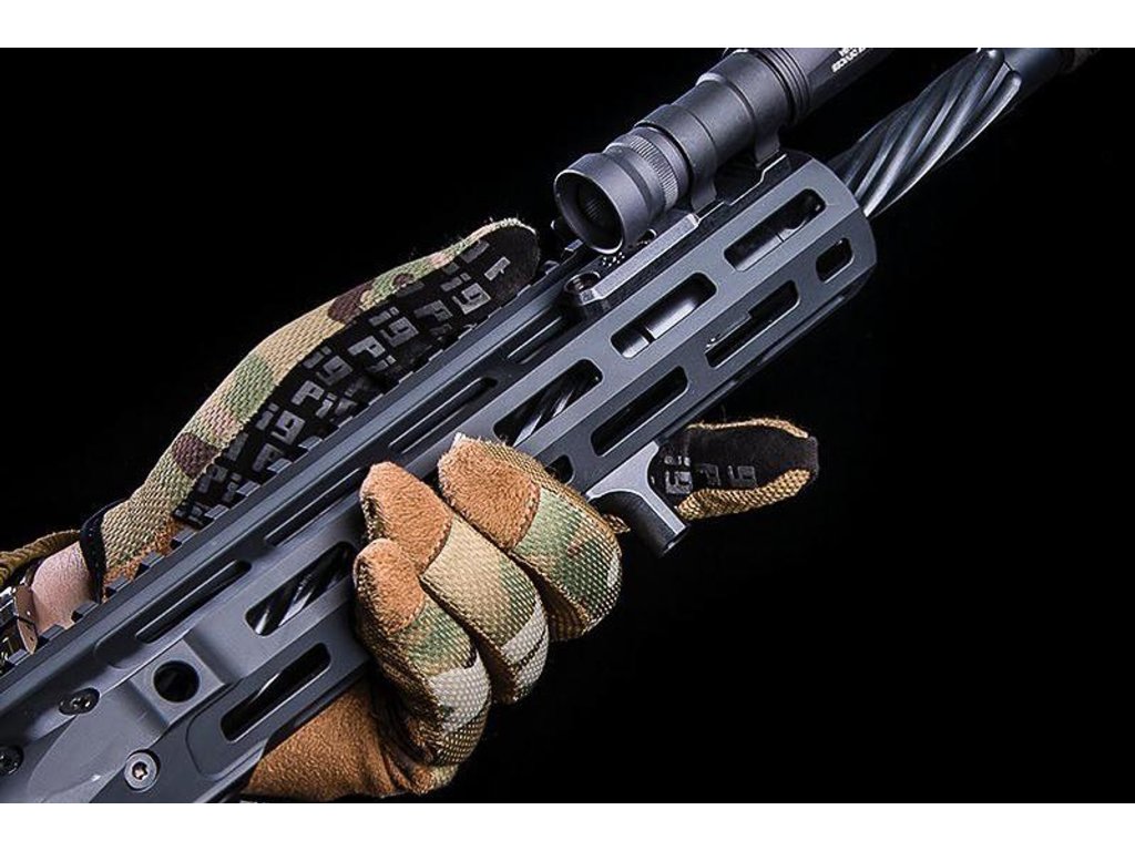 Zarážka prsta navyše dobre funguje ako predný obmedzovač, ktorý zabraňuje skĺznutiu prstov z kratších predpažbí na horúcu hlaveň alebo tlmič, a ako bariérová opierka.