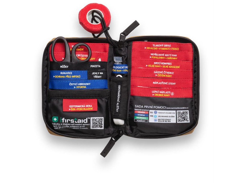 Farebne označené sekcie a prehľadný organizér umožňujú okamžitú orientáciu v krízových situáciách. Všetko je navyše kompletne v slovenčine – názvy položiek, návody aj karty prvej pomoci. Súčasťou je aj zadarmo aplikácia iFirstAid.