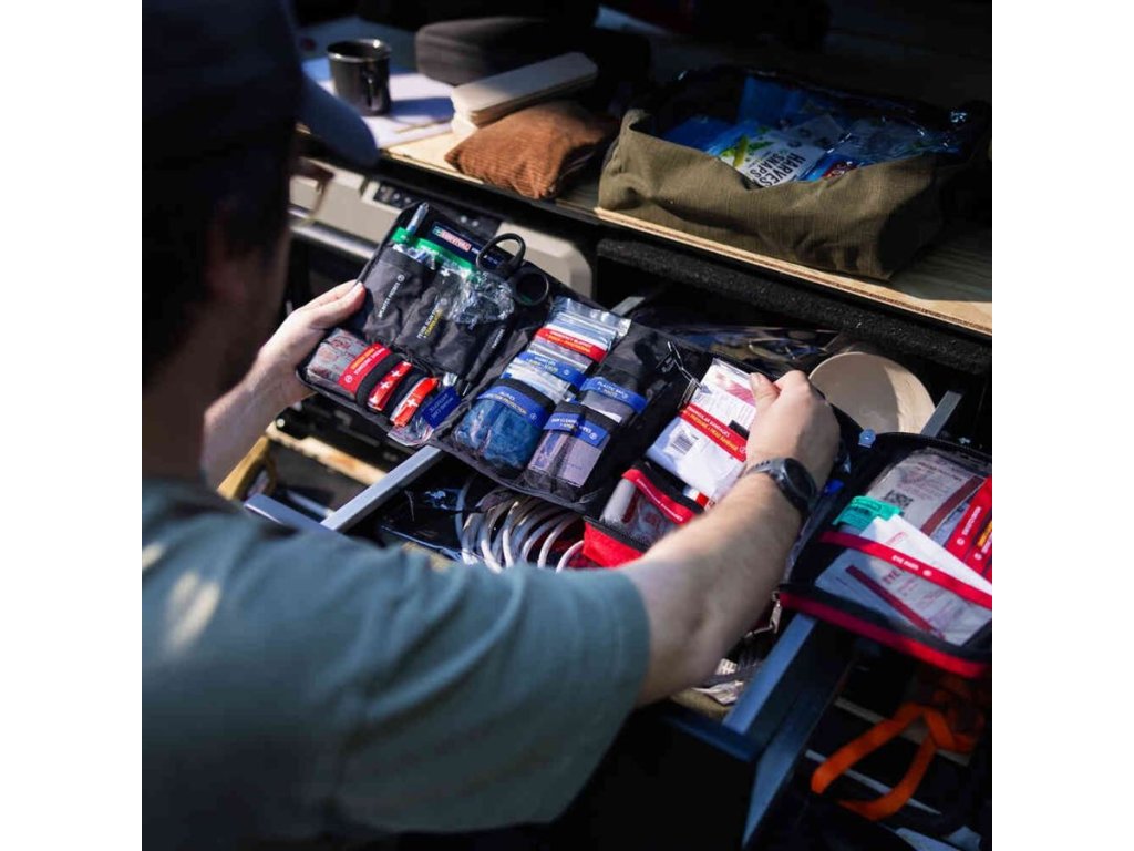 SURVIVAL First Aid KIT – Large je najobsiahlejšia lekárnička značky SURVIVAL, navrhnutá tak, aby bola rýchlo použiteľná aj v stresových situáciách. Vďaka farebným sekciám a jasnému označeniu položiek sa v nej vyzná každý – vybavenie je logicky rozdelené, ľahko dostupné a pripravené na okamžité použitie.