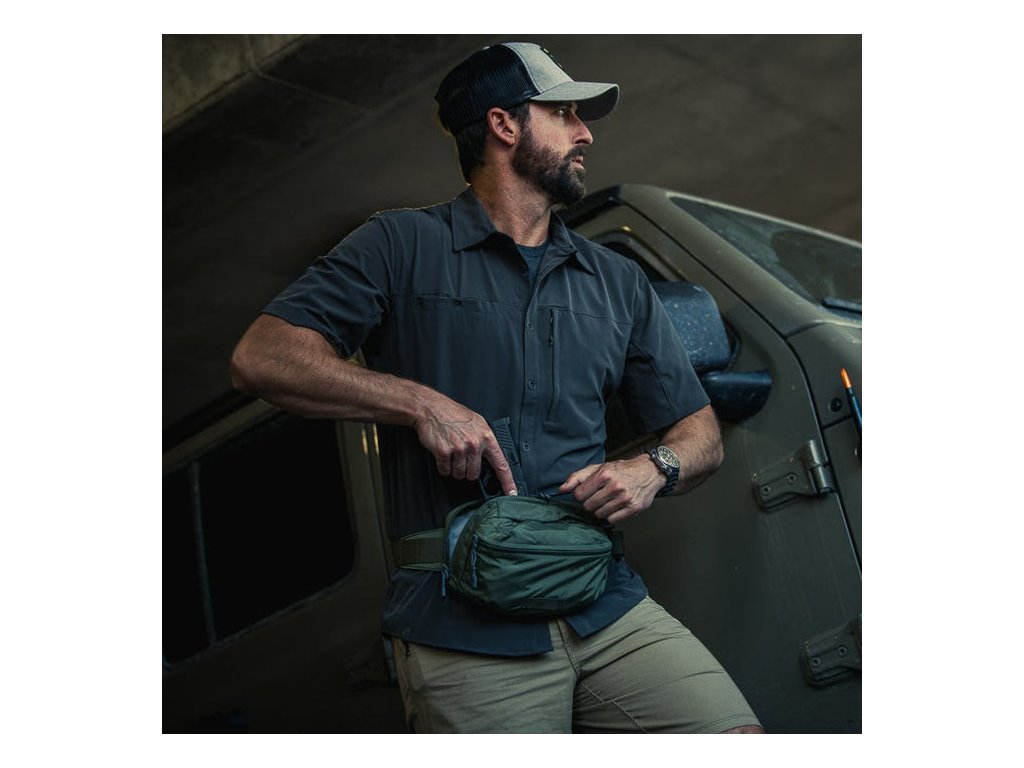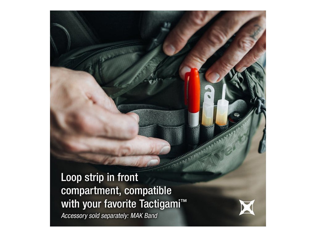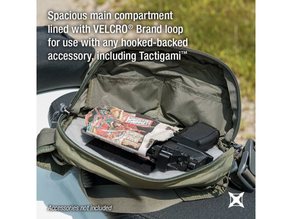 - Priestranná hlavná priehradka je vybavená pútkom so suchým zipsom VELCRO® pre flexibilné prispôsobenie pomocou nášho príslušenstva Tactigami™