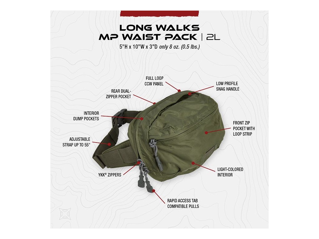 Vďaka ultraľahkej tkanine si môžete vziať so sebou všetky potrebné veci bez pocitu zaťaženia. Naše šikovne navrhnuté hlavné zipsy v kombinácii s inovatívnymi záložkami Rapid Access Tabs zabezpečujú bleskurýchly prístup k vašim veciam, kedykoľvek ich potrebujete. Zostaňte organizovaní a o krok vpred s ľadvinkou Long Walks MP – vaším dokonalým spoločníkom na všetky typy dlhých prechádzok.