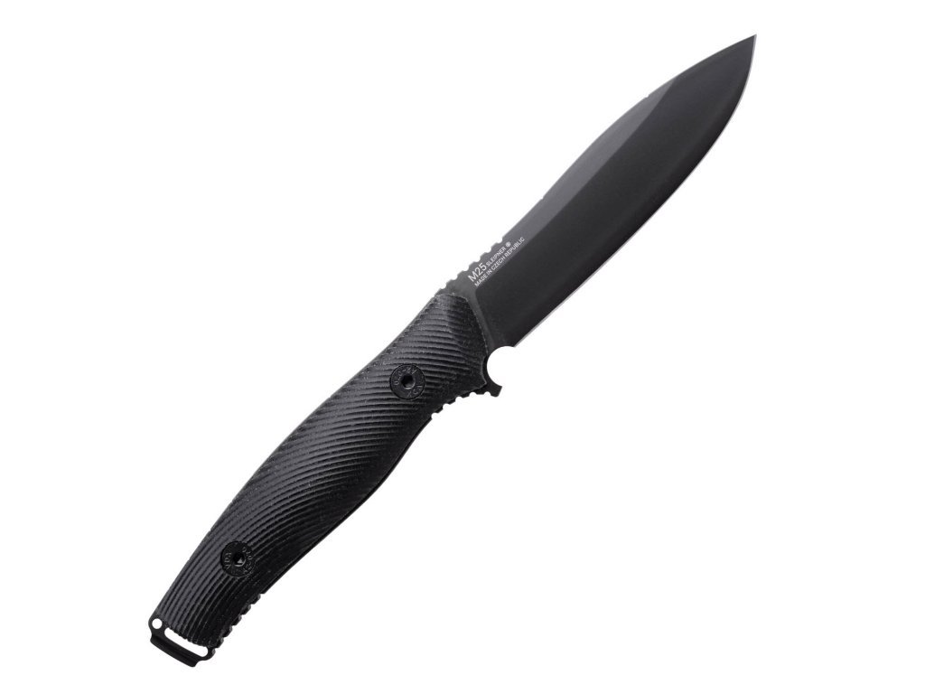 Tentoraz sme zvolili 3,5 mm hrubú kryokalenú čepeľ vyrobenú z ocele Sleipner, ktorá je dodatočne potiahnutá DLC pre zaistenie hladkého rezu, vysokého výkonu a minimálnej hmotnosti čepele. Rukoväť noža M25 sme presne vyfrézovali z bloku micarty a všetko sme zostavili pomocou skrutiek z nehrdzavejúcej ocele a pevných navarených púzdier. Na chrbte noža M25 sme vyfrézovali sériu zárezov, ktoré sú v presnej mierke mapy 1:25 000. Tieto zárezy jasne označujú polohu najprv po 250 m až 1 km a potom až do 5 km. Tento núdzový ukazovateľ umožňuje používateľovi rýchlo a presne merať oblasti na mape, ako napríklad efektívny dosah. Okrem toho sme koniec rukoväte vybavili nástrojom na upevnenie strely RBS. Alebo otváračom na pivo, podľa toho, čo používate častejšie. V neposlednom rade je čepeľ vybavená brúsenou hranou, ktorá umožňuje použitie ohňovej ocele. Celý systém sme vybavili samosvorným kydexovým puzdrom, ktoré umožňuje širokú škálu možností zavesenia.