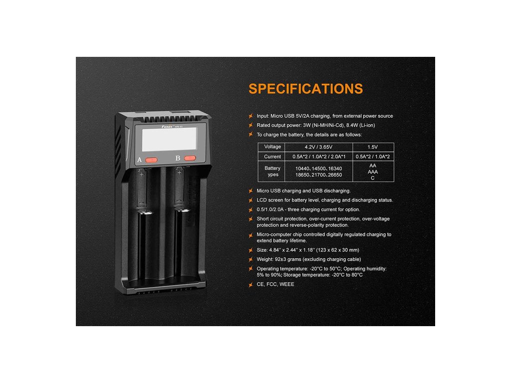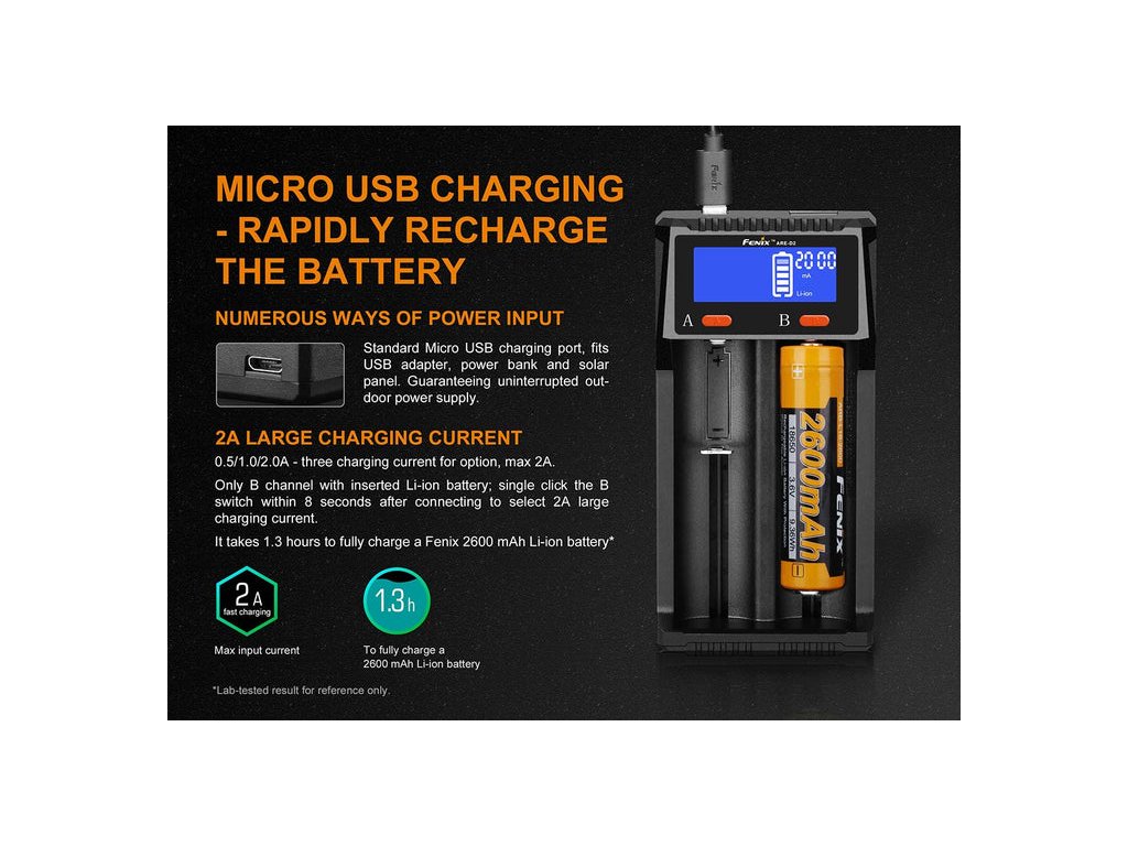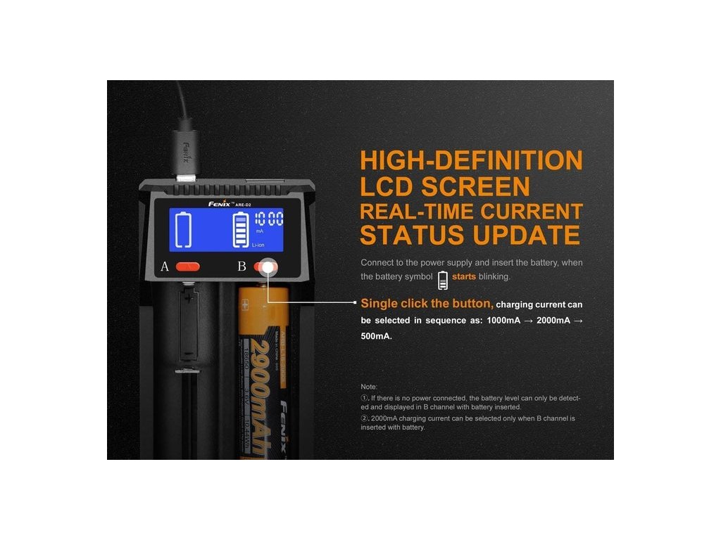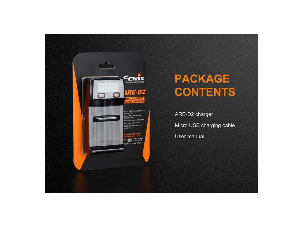 Fenix ARE-D2 je dvojkanálová inteligentná nabíjačka určená pre rôzne typy a veľkosti nabíjateľných batérií, či už ide o Li-ion, Ni-MH alebo Ni-Cd.
