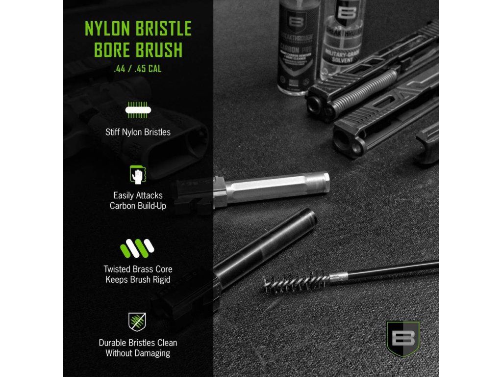 - KEFA NA ČISTENIE ZBRANÍ: Táto kefa na hlaveň kalibru .44 / .45 má závit #8-32, robustné mosadzné jadro a tuhé nylonové štetiny, ktoré odstraňujú silné usadeniny uhlíka vo vašej strelnej zbrani. Naša kefa na zbrane je praktickým doplnkom, ktorý môžete pridať do svojej súpravy na čistenie pištole.