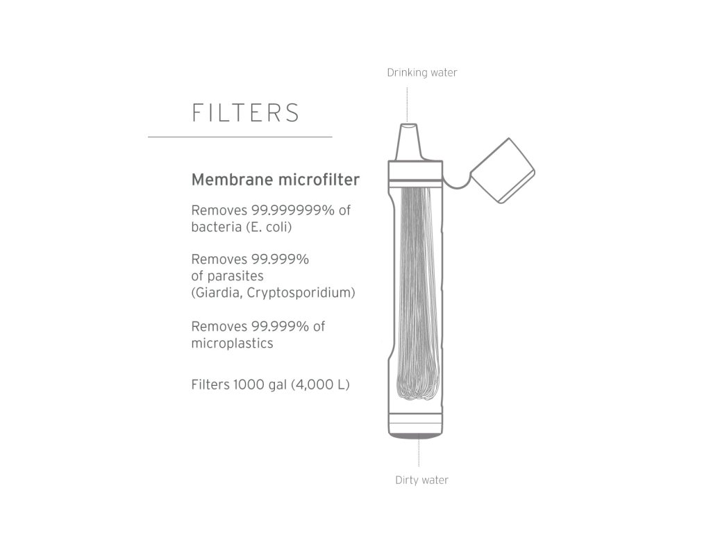 - Pite priamo z jazier, riek a potokov alebo naplňte nádobu a používajte svoj slamkový vodný filter na cestách s ochranou pred baktériami, parazitmi, mikroplastmi, bahnom, pieskom a zákalom.