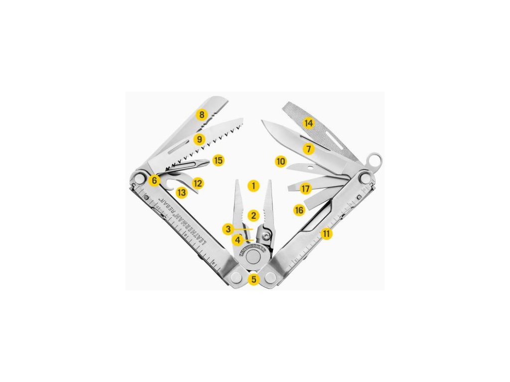 Dizajn multitoolu REBAR odkazuje na tradíciu značky Leatherman. Základom sú štíhle, zato veľmi silné multifunkčné kliešte s vymeniteľnými čepieľkami štiepačiek. Univerzálna výbava obsahuje všetky dôležité základné nástroje a uspokojí všetky: od domácich majstrov, cez profi montérov až po výletníkov a turistov. Každý zo sedemnástich funkčných nástrojov je vybavený poistkou proti nechcenému sklopeniu. Okrem tradičných kombinovaných klieští obsahuje multitool Leatherman REBAR dva nože s rovným a zubatým ostrím z nerezovej ocele 420HC, pílku, šidlo, sadu otváračov na konzervy aj na fľaše, pilníky na kov aj na drevo a sadu skrutkovačov. V 190 gramoch ocele si skrátka každý nájde to svoje. K dostaniu v niekoľkých farebných variantoch.