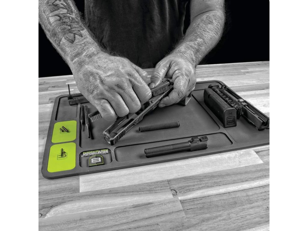 Obsahuje tiež viacero priehradiek na úhľadné uloženie a organizáciu malých komponentov. Táto podložka je vhodná pre väčšinu pištolí a poskytuje bezpečný a efektívny pracovný priestor pre všetky vaše potreby údržby pištole.