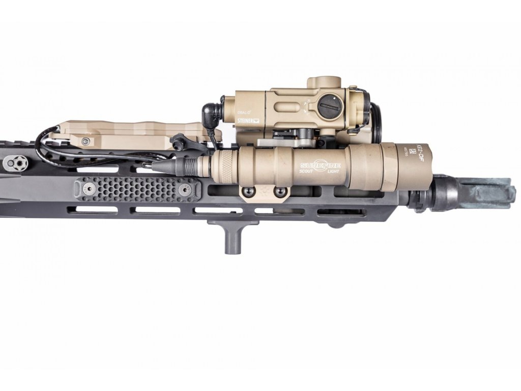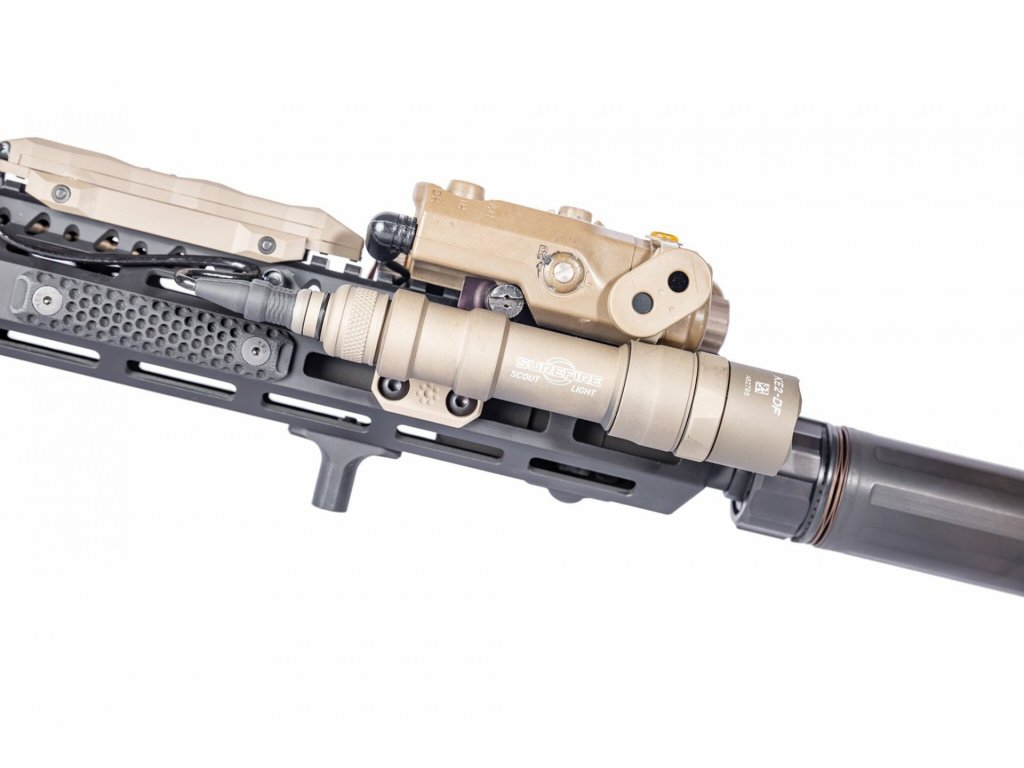 Na demontáž štandardného držiaka Picatinny zo svietidiel Surefire Scout je potrebný kľúč T9 Torx. Odporúčaný krútiaci moment: 12,7 cm/lb pre skrutky M-Lok a 6,1 cm/lb pre skrutky tela svetla so stredne silným zaisťovačom závitu.