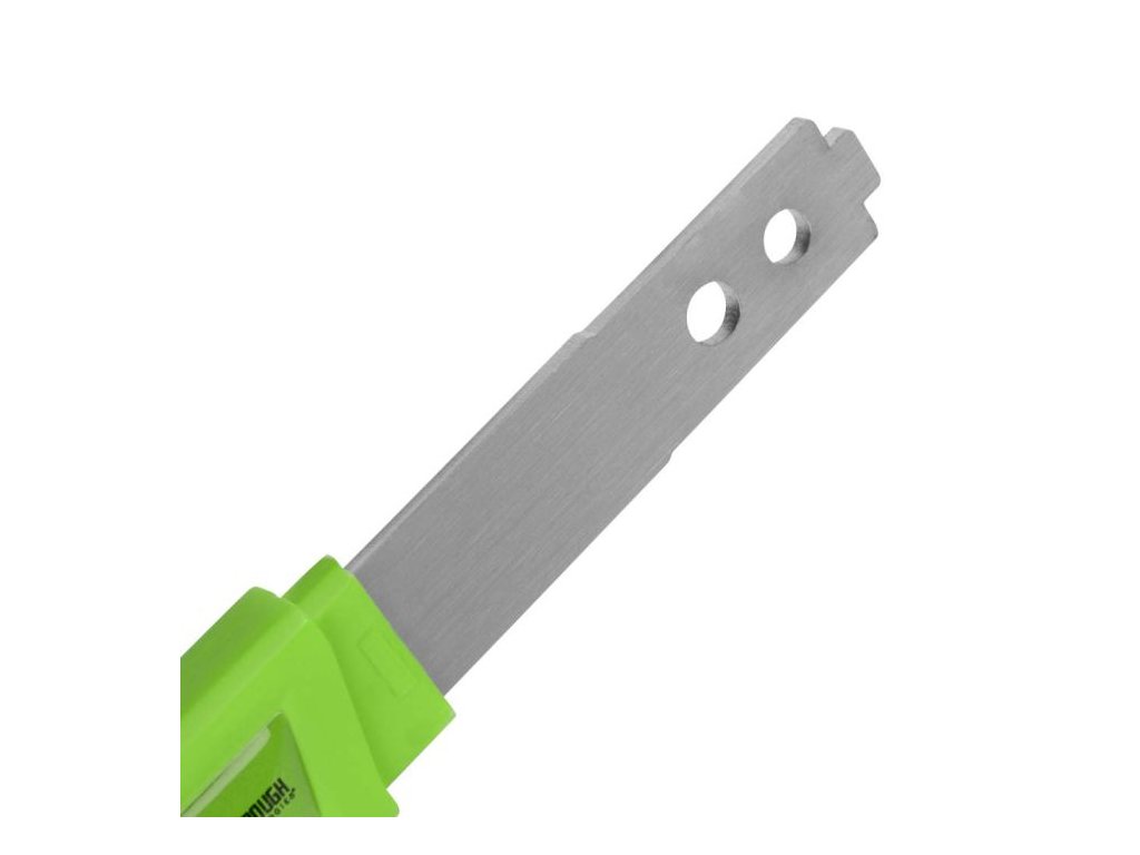Obojstranná čepeľ, skrytá pod ochrannými dvojitými krytkami, a ergonomická rukoväť umožňujú rýchle a efektívne odstraňovanie uhlíkových usadenín.