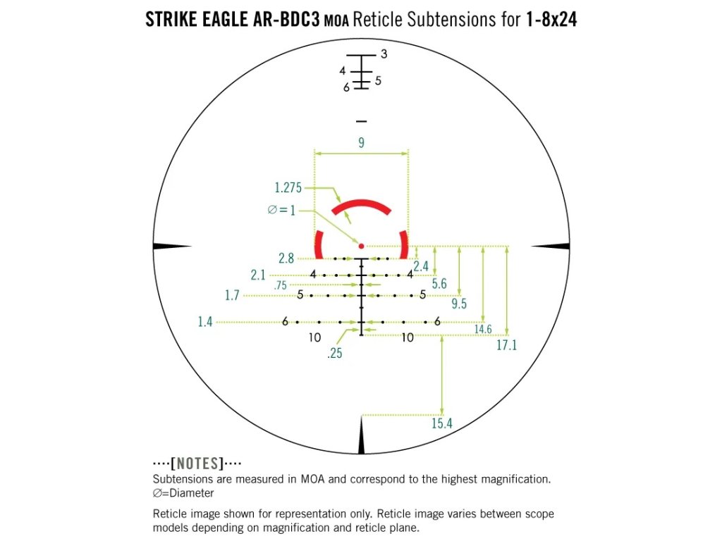 Vortex STRIKE EAGLE® 1-8X24 AR-BDC3 (MOA) - nová verzia známeho puškohľadu Vortex Strike Eagle. Optimalizujte všestrannosť a možnosť rýchleho použitia Vašej pušky typu AR. So skutočným 1x zväčšením, integrovanou zoomovacou páčkou a max. 8 násobným zoomom môžete rýchlo meniť nastavenie medzi blízkymi aj vzdialenými cieľmi. Nový zámerný kríž AR-BDC3 pomôže v rýchlej streľbe až na 600 yardov (cca 550 m).