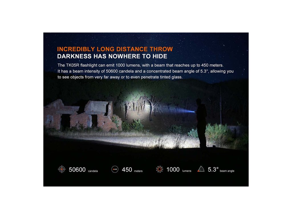 Toto kompaktné svetlo vytvára intenzívny, koncentrovaný lúč, ktorý dokáže vrhnúť maximálne 1000 lúmenov na vzdialenosť 427 metrov. Tento silný lúč dokáže preniknúť aj cez optické bariéry, ako je tónované sklo.