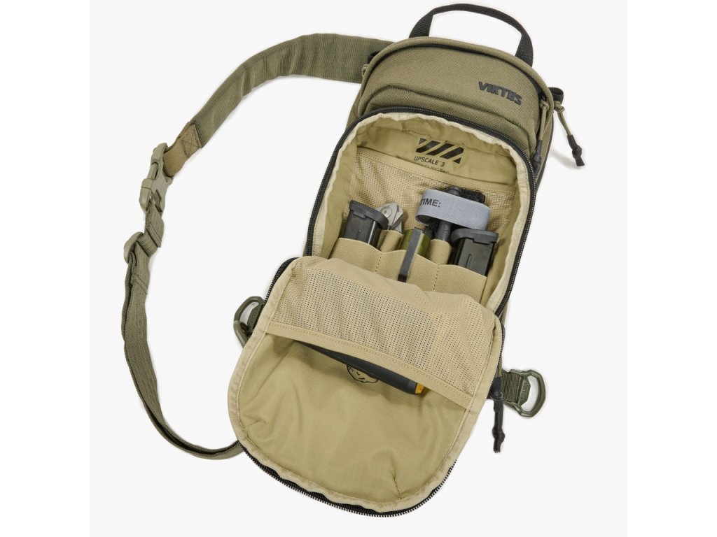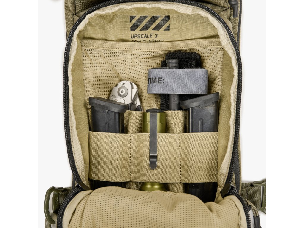 Taška cez rameno Upscale3™ je väčšia ako náprsná taška, ale menšia ako súčasné taktické tašky cez rameno a bola navrhnutá pre vaše minimalistické skryté nosenie a EDC potreby. Priehradka na skryté nosenie sa zmestí až na pištoľ plnej veľkosti v priloženom univerzálnom puzdre so suchým zipsom alebo ju môžete vymeniť za vaše preferované puzdro. Obojstranný, ľahko polstrovaný popruh a priehradka na skryté nosenie umožňujú jednoduchý prístup k pištoli pri nosení na oboch stranách tela. Hlavná priehradka je vybavená elastickým popruhom a vnútorným vreckom, ideálnym na uloženie ďalších zásobníkov, škrtidla a lekárničky. Polstrovaná horná priehradka je ideálnym miestom na okuliare.