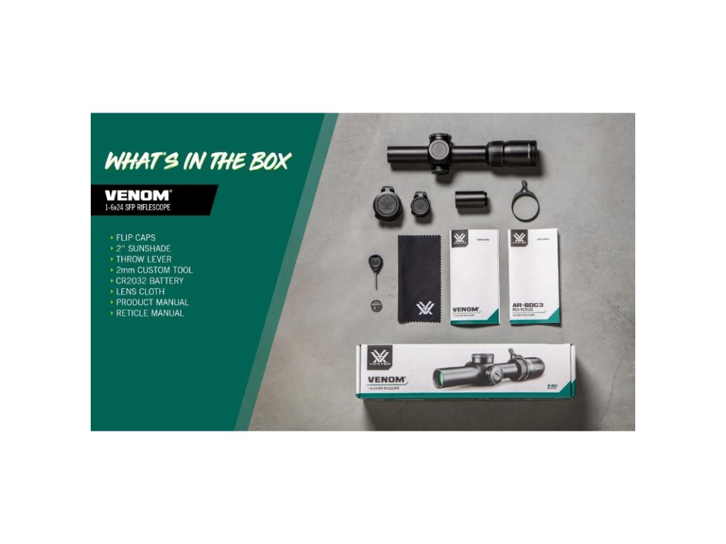 Vortex VENOM® 1-6X24 SFP - nový puškohľad roku 2024 , upgrade modelu Strike Eagle 1-6x24. Rýchlosť, spoľahlivosť a presnosť . Venom® 1-6x24 SFP poskytuje 1 až 6 násobné zväčšenie, zámerný kríž AR-BDC3 pre presnú streľbu na krátke až stredne vzdialené ciele.