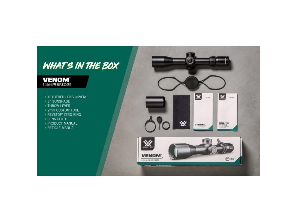 Vortex VENOM® 3-15X44 FFP - presné a spoľahlivé puškohľady so skvelou kvalitou optiky, pôsobivé zväčšenie a všestranný zámerný kríž EBR-7C pre rýchle a presné korekcie na diaľku, široké zorné pole pri rýchlom zacielení zblízka.