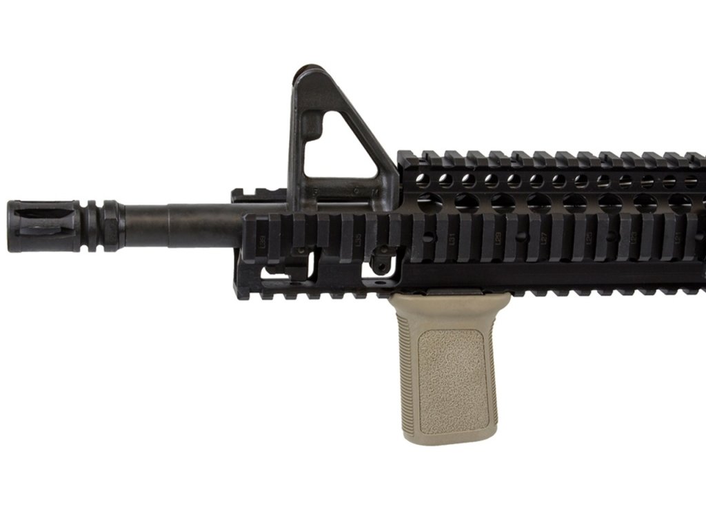 - Ploché strany s agresívnou textúrou poskytujú strelcovi lepšiu kontrolu nad stáčaním počas streľby aj manipulácie mimo nej.